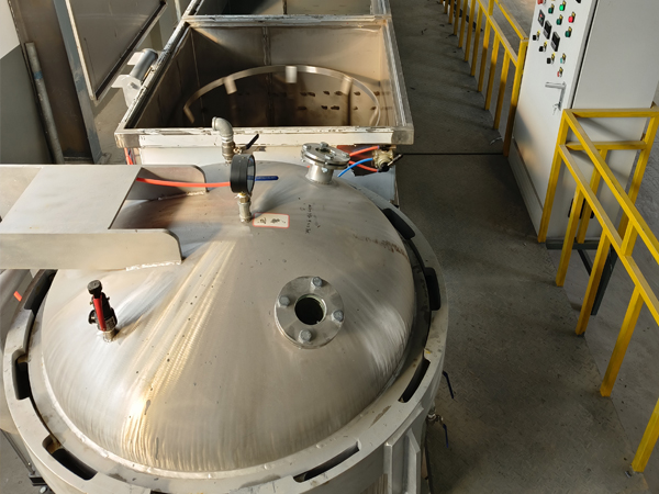 ●浸滲完畢,打開浸滲罐的蓋子,用吊鉤把浸滲籃吊離浸滲罐,讓浸滲籃及其內(nèi)裝零件表面粘附液滴干,放入甩干機,將膠液甩干,然后把浸滲籃移至洗滌罐中。
